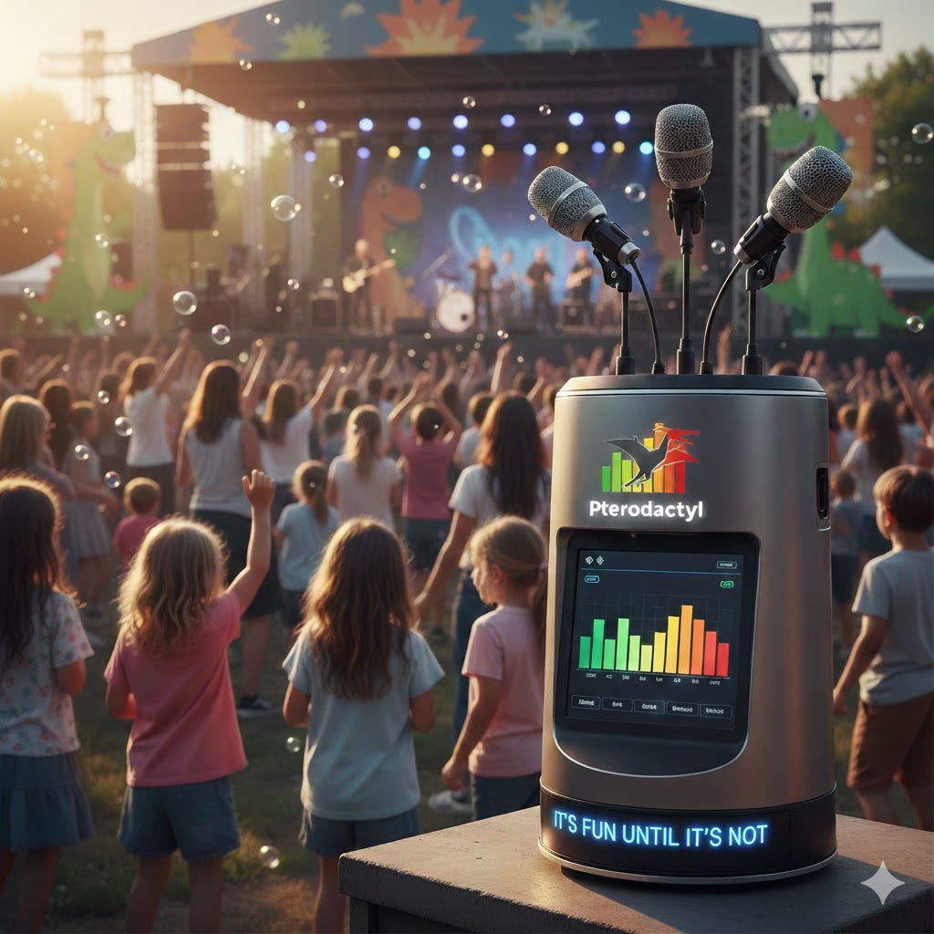 Pterodactyl has three to five directional microphones mounted on poles around the crowd perimeter. Each mic feeds into a local edge processor. No audio is recorded or stored, only live frequency and amplitude data.
